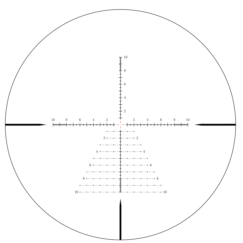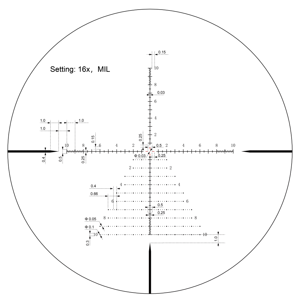 Сетка - типа VAT-6 MIL, с подсветкой, яркость регулируемая (6 уровней); используемый элемент питания - CR2032. Прицельная марка расположена во второй фокальной плоскости (SFP). Отстройка параллакса боковая, от 10 ярдов (~9,1 м) до бесконечности. Возможен ввод горизонтальной и вертикальной поправок; цена клика барабанчиков регулировок - 1/10 MIL, диапазон регулировки - 30 MIL по высоте и 18 MIL по горизонту. Компенсация диоптрий возможна в диапазоне от -2 до +2 дптр.